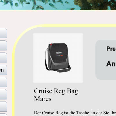 Diverse Auslaufmodelle  Sonderpreis:                       99,00 €  Tauchrucksäcke diverse Modelle Angebot gültig solange Vorrat reicht! Preis:	               	    29,00 €					 Angebot:                25,00 €  Cruise Reg Bag Mares  Der Cruise Reg ist die Tasche, in der Sie Ihr Tablet und Dokumente transportieren können.  Oder er hat die Möglichkeit, auch Ihre Dispenser aufzunehmen. Der Schultergurt macht ihn perfekt für Ihre Reisen.  Die Hauptmerkmale des Cruise Reg sind: - Verstellbarer Schultergurt - Interne Netztasche mit Reißverschluss - Separates Tablet-Fach - Tasche für Visitenkarten - Mikroeingespritzte farbige Reißverschluss-Zieher mit Mares-Logo Angebot gültig solange Vorrat reicht! Preis:	               	    279,00 €					 Angebot:                249,00 €  Cruise Backpack  Mares  Cruise Backpack ist die perfekte Reisetasche. Sie ist leicht, vielseitig und hat große Räder, einen Teleskopgriff, Schultergurte und Flossentaschen.      TELESKOPGRIFF     GROSSE ROBUSTE RÄDER     ÄUSSERES FLOSSENFACH MIT ENTWÄSSERUNGSSYSTEM     VERSTELLBARE KOMPRESSIONSBÄNDER     ZWEIFARBIGE, ULTRALEICHTE SCHNALLEN     ZWEI GRIFFE AUS AIR-MESH     GEPOLSTERTE SCHULTERGURTE     INTEGRIERTE FRONTTASCHE MIT REISSVERSCHLUSS     TELESKOPGRIFF     LEICHT     A.T.O. - AIR TRAVEL OPTIMIZED (OPTIMIERT FÜR DEN LUFTTRANSPORT) Angebot gültig solange Vorrat reicht! Preis:	               	    289,00 €					 Angebot:                259,00 €  Cruise Backpack Pro Mares  Der Cruise Backpack Pro ist kompakter und leichter als das Vorgängermodell. Viele nützliche Eigenschaften in modernem Design.      TELESKOPGRIFF     GROSSE ROBUSTE RÄDER     ÄUSSERES FLOSSENFACH MIT ENTWÄSSERUNGSSYSTEM     VERSTELLBARE KOMPRESSIONSBÄNDER     ZWEIFARBIGE, ULTRALEICHTE SCHNALLEN     ZWEI GRIFFE AUS AIR-MESH     GEPOLSTERTE SCHULTERGURTE     INTEGRIERTE FRONTTASCHE MIT REISSVERSCHLUSS     TELESKOPGRIFF     LEICHT     A.T.O. - AIR TRAVEL OPTIMIZED (OPTIMIERT FÜR DEN LUFTTRANSPORT)